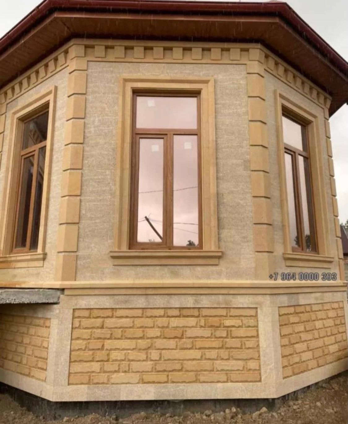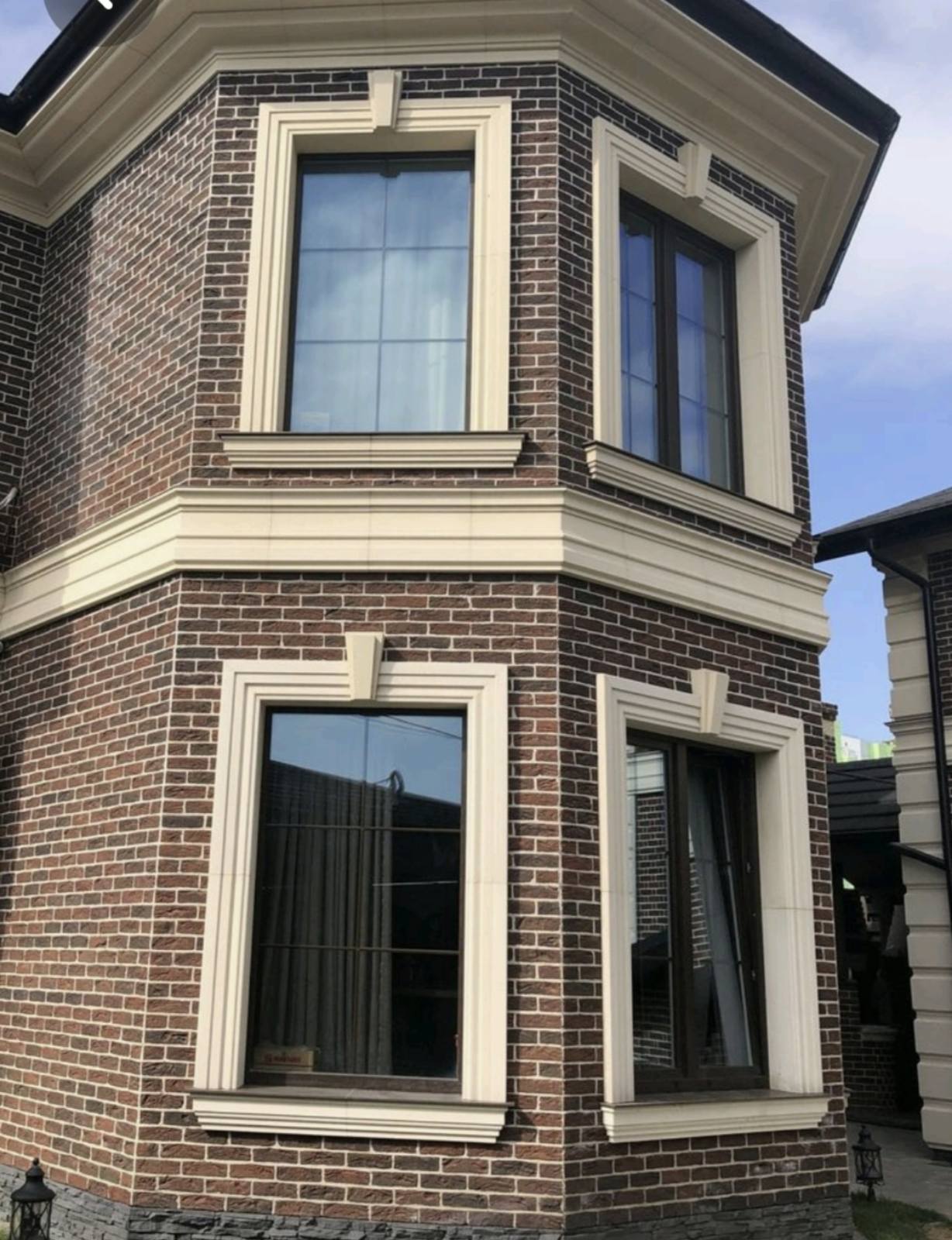 Присутствие наличников на окнах фасада при отделке дома из натурального камня играет немалую роль при выборе архитектурного стиля, придавая всему зданию законченность и визуально украшает оконные и дверные проёмы.