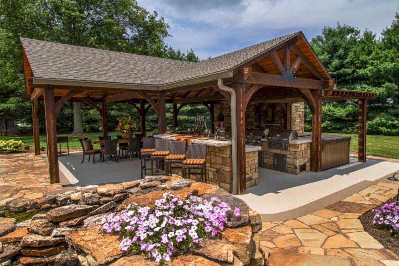 Современные беседки комбинируются из натурального камня, кирпича, дерева. Такие беседки служат прекрасным дополнением ландшафта, они востребованы, защищают от непогоды и подходят для обустройства зоны для барбекю. Такое сочетание позволяет сэкономить на приобретении камня и делает постройку более гармоничной.