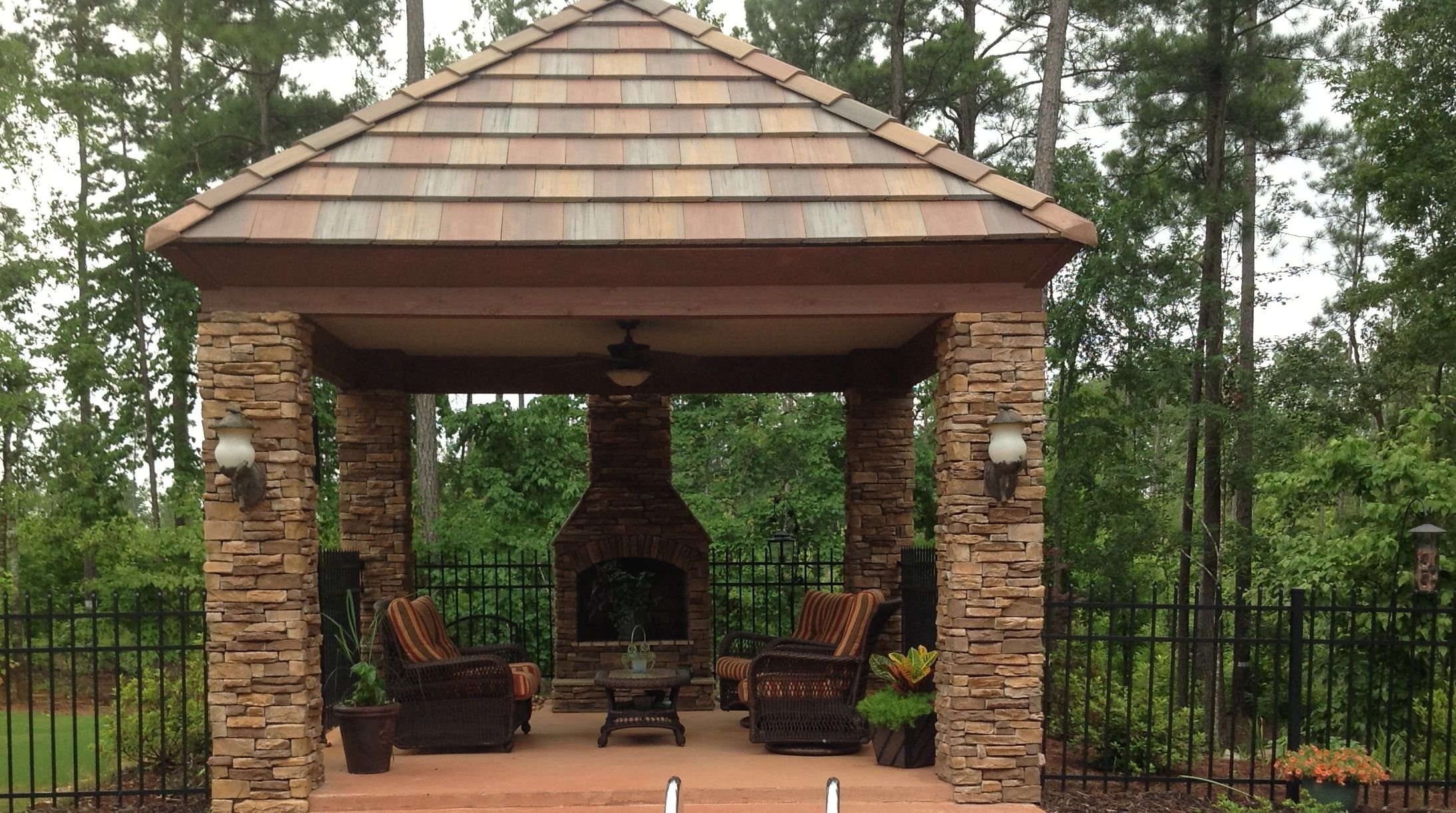 Современные беседки чаще всего комбинированные из натурального камня, кирпича, дерева